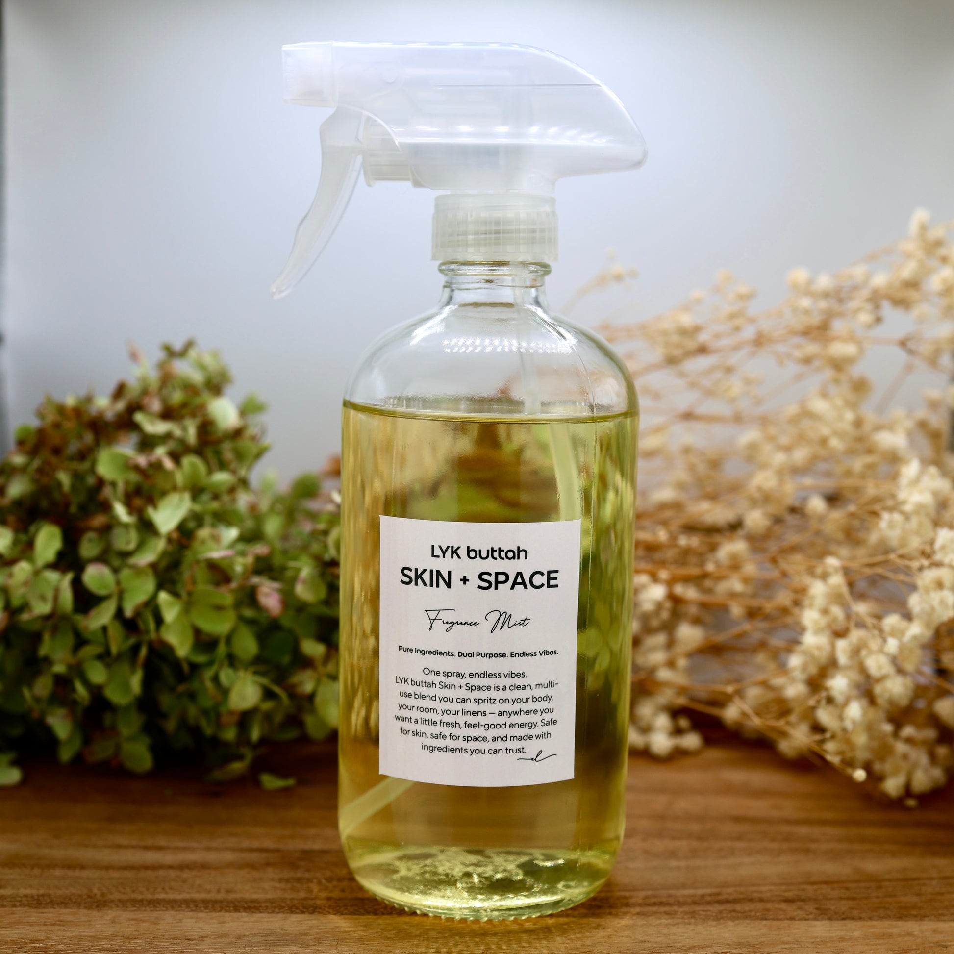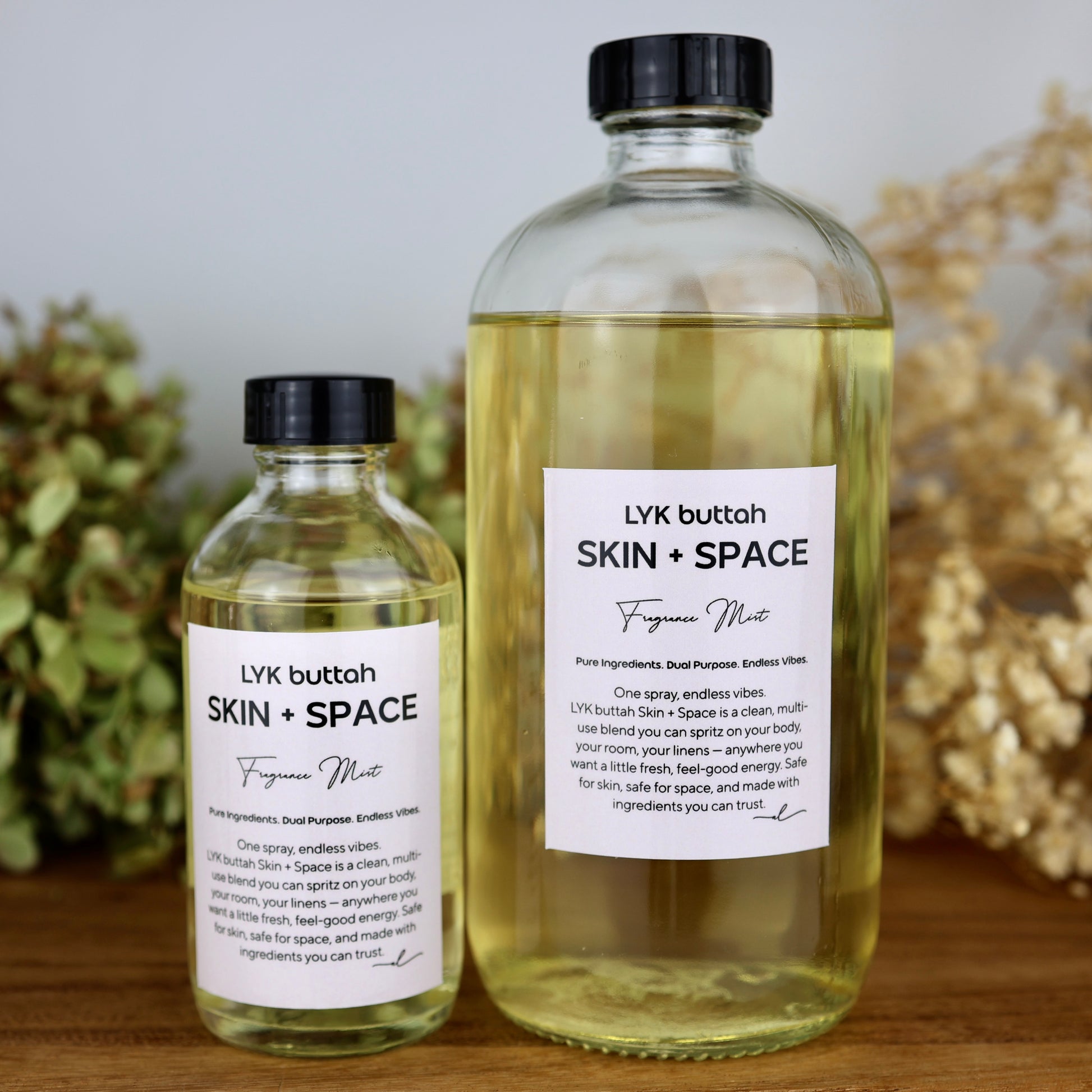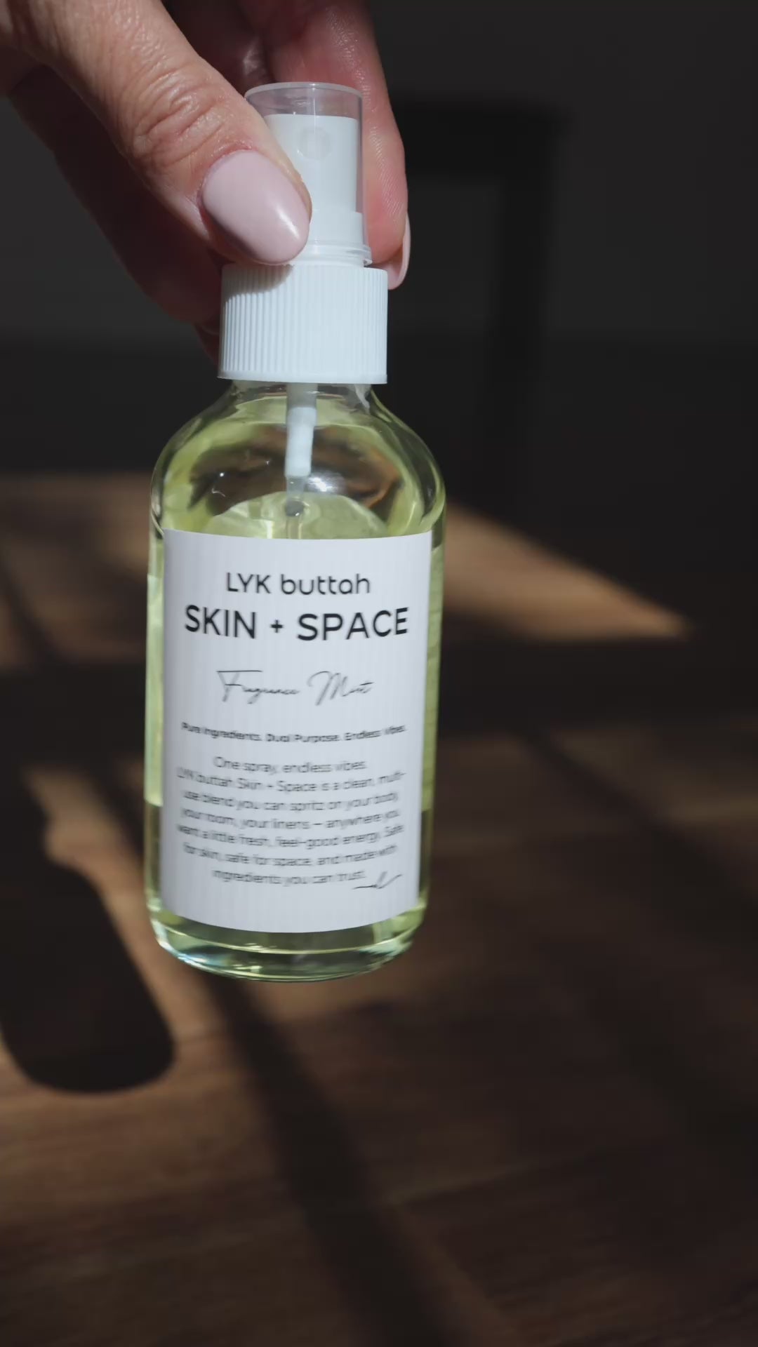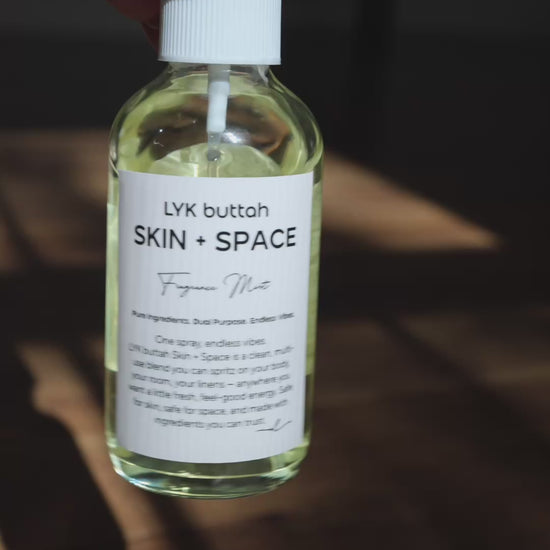 Introducing the LYK buttah Skin + Space Fragrance Mist — a clean, luxurious way to refresh your skin and your surroundings. Handcrafted with non-toxic, pet-safe ingredients, this multitasking mist instantly uplifts your mood, leaving behind a soft, inviting aroma that lingers like a cozy hug. Designed for the homebody who loves simplicity, comfort, and clean beauty.